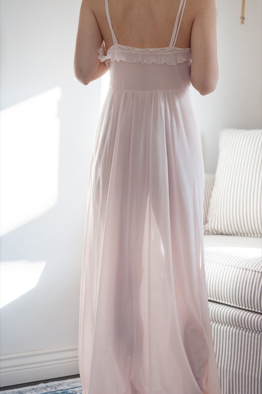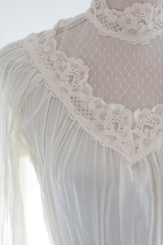 Vintage 1970s Gauze Sheer Midi Dress with Lace Collar